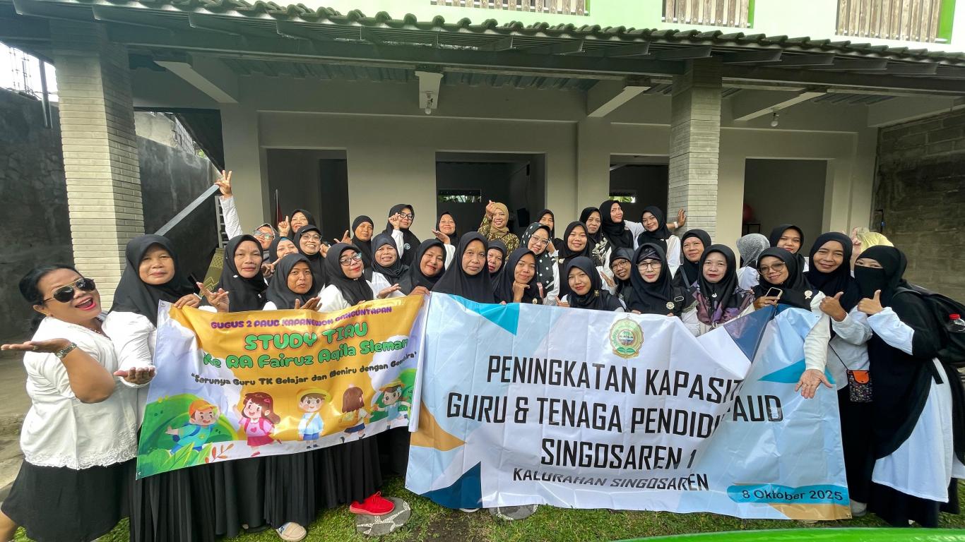 Pemerintah Kalurahan Singosaren melaksanakan kegiatan Peningkatan Kapasitas Pengajar dan Tenaga Kependidikan PAUD Jelita Padukuhan Singosaren I melalui kegiatan kunjungan/studi tiru ke PAUD Fairuz Aqila, Kalasan, Sleman.